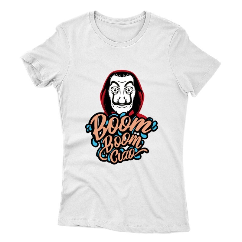 A nagy pénzrablás Boom Boom Ciao mintás póló megrendelhető női, férfi és gyerek fazonban egyaránt S-től 3XL-es méretig.
