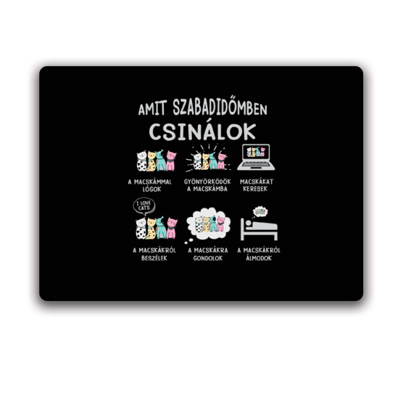 Akik szeretik a macskákat már tudják, hogy rendkívül különleges állatok. Egyik percben a függönyt szabdalják és ezzel kergetnek az őrületbe. Vagy épp keservesen nyávognak, ha 5 percet késel a reggelijükkel. A leglehetetlenebb helyeken és nyakatekert pózokban tudnak aludni, szívesen kotorják ki a virágföldet vagy karmolják össze a lábadat (persze csak szeretetből). Néha az agyunkra tudnak menni, ám amilyen furcsaságokat tudnak elkövetni, épp olyan szeretetre méltóak is. Egy ölben doromboló cicánál kevés megnyugtatóbb dolog van a világon. Számos módon tudják kifejezni, hogy - bár ők az úr a háznál - de azért kedvelnek, sőt szeretnek is minket. Egy öntörvényű macska szeretetét és ragaszkodását nem könnyű elérni, ezért is szeretjük őket ennyire. Ha Te is macskatartó vagy, vagy csak szimplán rajongsz a kis szőrmókokért, akkor nem kérdés, hogy az Amit szabadidőmben csinálok mintás macskás pólónk tetszeni fog Neked!
