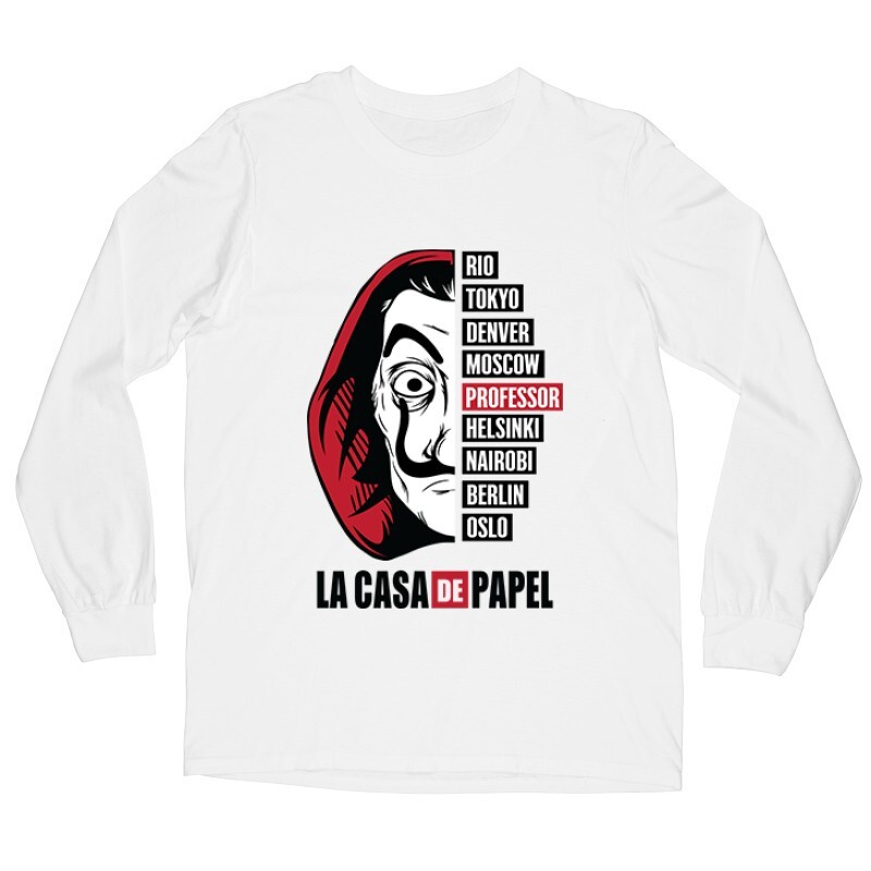A nagy pénzrablás sorozat (mely Money Heist, vagy éppen La Casa De Papel néven ismert) a Netflix egyik új, de annál népszerűbb spanyol sorozata. Jó sztori, jó szereplők, jó képi világ. Ha Neked is kedvenceddé vált a sorozat, akkor a nagy pénzrablás Dali Full Name mintás pólónk remek választás lesz számodra!
