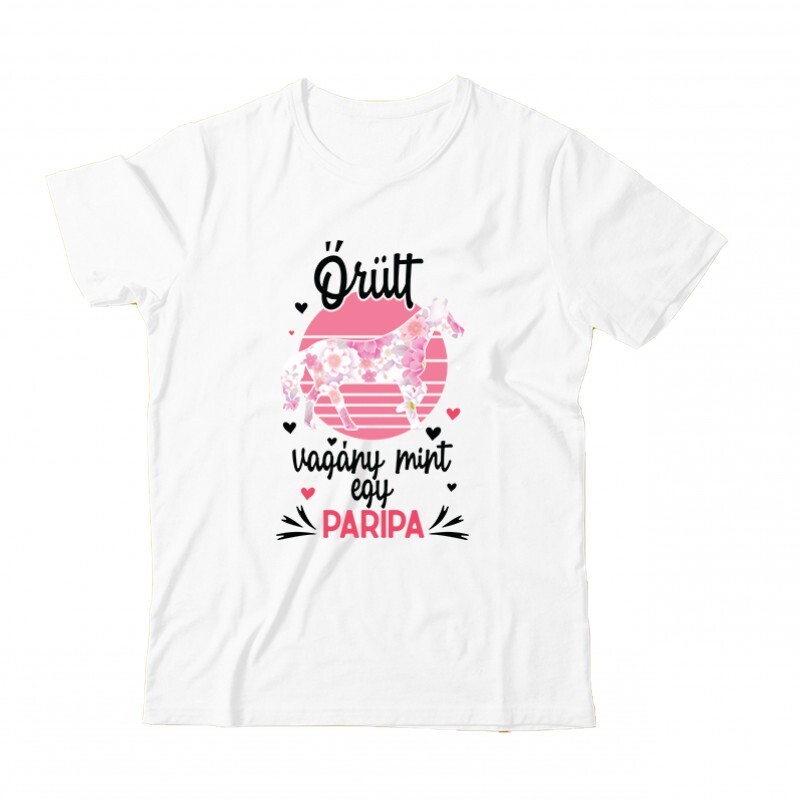 Az Őrült mint egy paripa mintás lovas póló megrendelhető női, férfi és gyerek fazonban egyaránt S-től 3XL-es méretig.