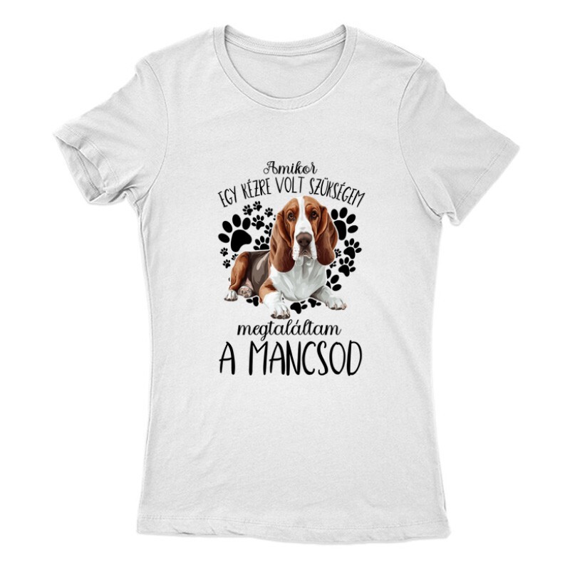 Ajándékot keresel egy kutyarajongó ismerősödnek? A Megtaláltam a mancsod  Basset hound mintás Kutyás pólónk ajándéknak is kiváló!