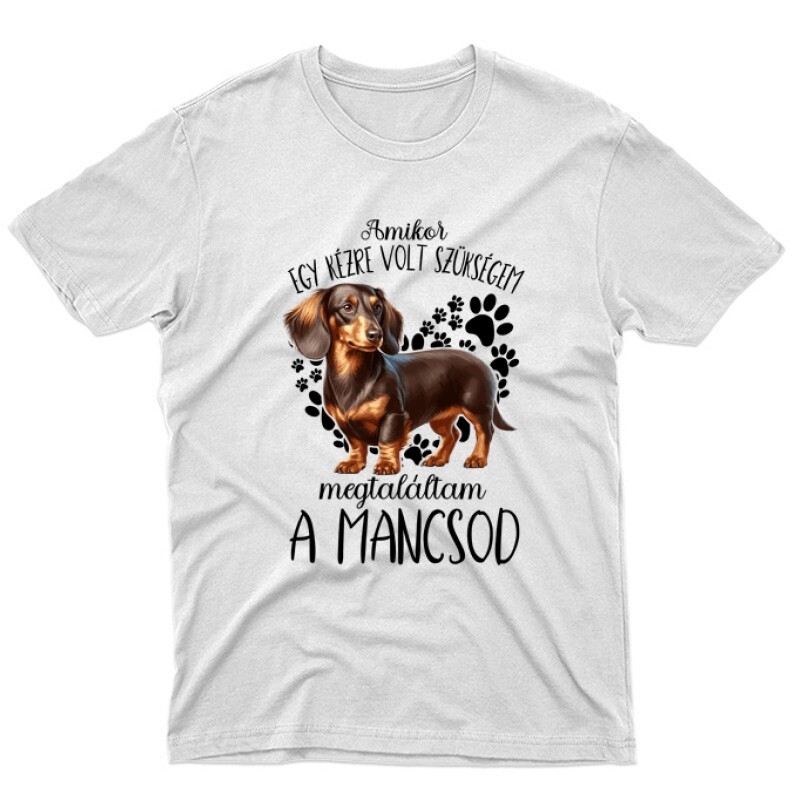 Ajándékot keresel egy kutyarajongó ismerősödnek? A Megtaláltam a mancsod Hosszúszőrű tacskó mintás Kutyás pólónk ajándéknak is kiváló!