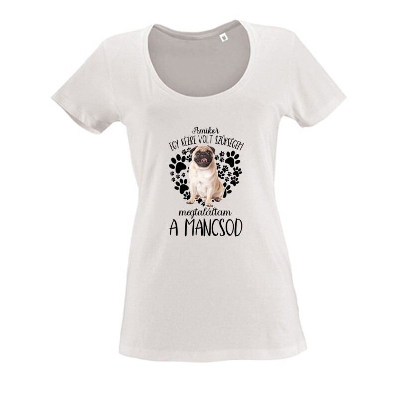 A Megtaláltam a mancsod  Mopsz mintás Kutyás póló megrendelhető női, férfi és gyerek fazonban egyaránt S-től 3XL-es méretig.