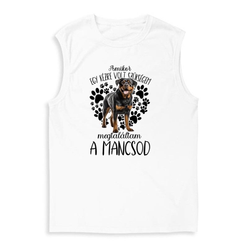 Feltétlen hűség és bizalom! Szinte mindenki ezzel kezdené, ha ismertetnie kellene egy kutya jellemét. Megmagyarázhatatlan rajongás és bizalom árad ezekből a fantasztikus állatokból, akiket így nem csoda, hogy olyan sok ember imád. Legyen kistestű, nagytestű, hosszú szőrű vagy rövid, fajtiszta, vagy keverék, csintalan esetleg a család hangulatfelelőse, biztos, hogy számtalan emlékezetes percet és rengeted boldog évet ajándékoznak ezek a rendkívüli négylábúak a gazdáiknak. Ha Te is oda (meg vissza) vagy a kutyákért, és feldobnád a ruhatárad valami egyedi darabbal, akkor nem is kell tovább keresgélned! A Megtaláltam a mancsod  rottweiler mintás kutyás pólónk az állatbarátok nagy kedvence, így biztosak vagyunk benne, hogy a Te szívedet is megdobogtatja majd!